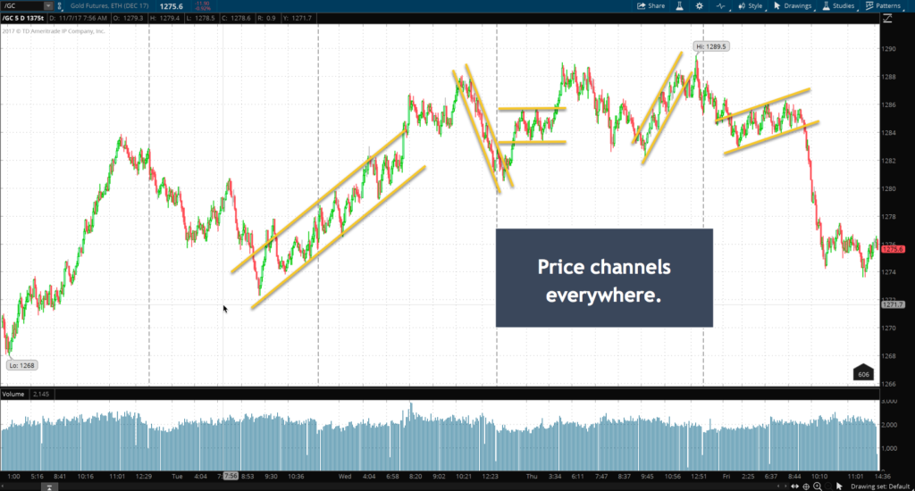 First, we can look for price trading in a channel. This channel can be horizontal or sloped upwards or downwards. Whichever direction the price channel may be angling it is defined by at least two highs and two lows. Trend lines can be drawn across the highs and then across the lows in order to visually see the channel in action. Often price will test the upper or lower bounds of the channel many times before breaking out.